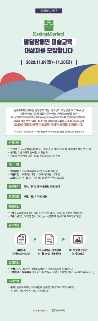 밀알복지재단에서는 발달장애 아동·청소년의 가능성을 ‘보고(Seeing), 그들이 예술가로서 성장하길 바라는 ‘희망(Spring)’을 담아 KB국민카드의 지원으로 봄(Seeing&Spring)프로젝트를 운영하고 있습니다. 미술에 재능 있는 아동 ·청소년을 발굴하여 교육의 기회를 제공하고자 ‘2020년 발달장애인 미술교육 대상자 모집’을 진행합니다.