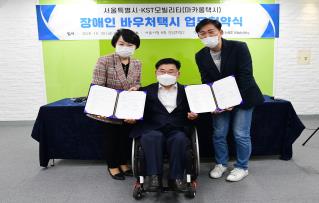 (좌) 서울시 복지정책실장(김선순) (우) KST모빌리티 대표이사(이행열) (앞) 안진환 장애인 명예시장