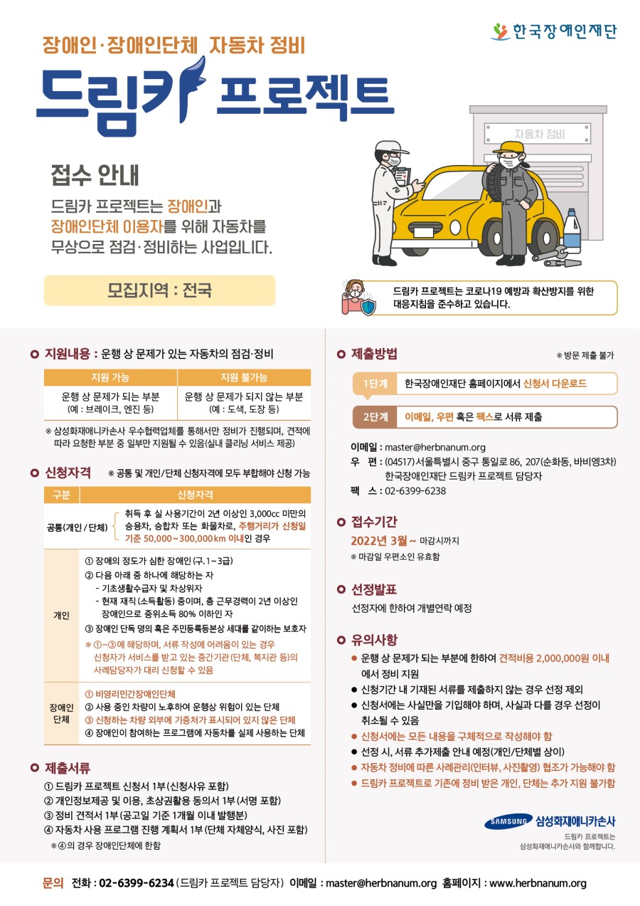 -기타문의 : 02-6399-6234 한국장애인재단 지원사업팀 드림카 프로젝트 담당자