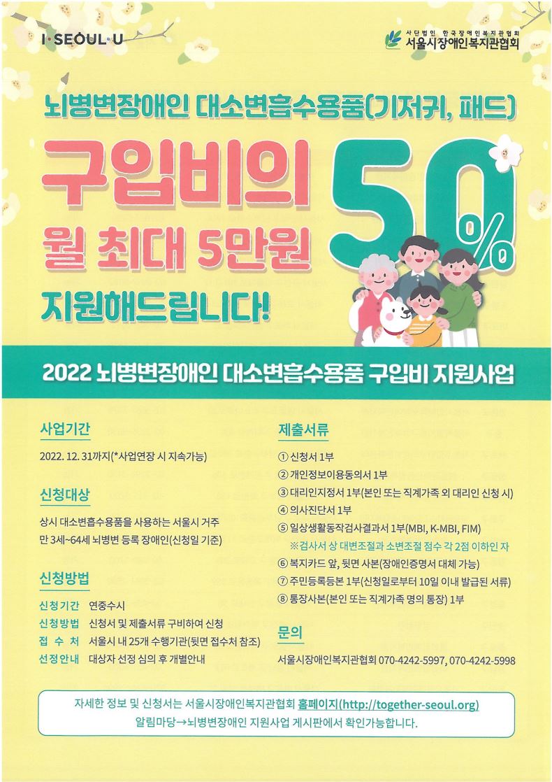 » 2022년 뇌병변장애인 대소변흡수용품 구입비 지원사업 file Good Job 자립생활센터 2022.05.11 191